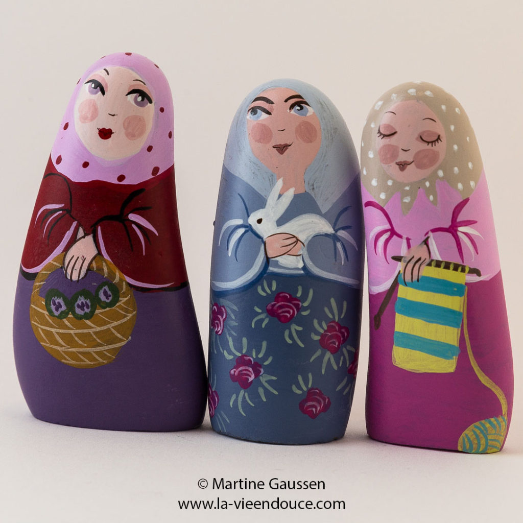Home / La Tricoteuse, la Fermière au lapin et la Marchande de violettes sont des santons de Noel originaux peints sur galets