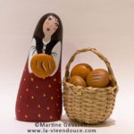 Le santon la belle boulangère apporte un petit pain tout chaud, lui aussi en galet peint. Très coquette, elle a mis ses plus beaux habits: son petit caraco, sa blouse blanche.