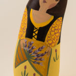 Le santon la provençale a mis ses beaux habits de fête assortis à ceux de son époux le violoniste. Elle apporte de la lavande séchée pour parfumer l’étable.