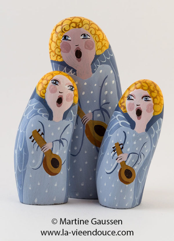 Ou alors, pourquoi ne pas imaginer et mettre en scène un chœur d’Anges? Plusieurs santons côte à côte, de différentes tailles, qui chanteront à pleine voix en se regardant de manière complice ?